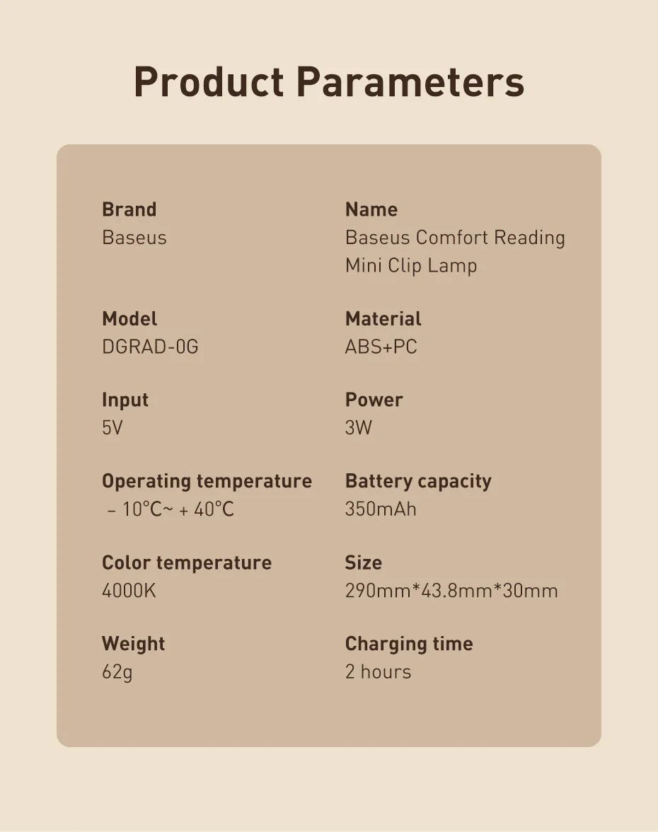 Model Number: Baseus Comfort Reading Mini Clip Lamp Dark Gray
