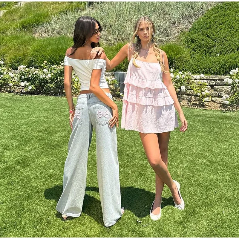 Charming Bow Embroidery😍: The delicate pink bow designs on the back pockets add a sweet and stylish touch, making these jeans stand out.