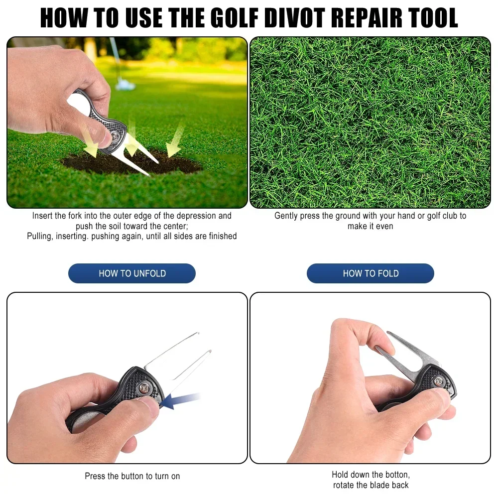 Golf Divot Repair Tool with Golf Ball Tool Pitch Groove Cleaner Putting Green Fork Training Aids Foldable Golf Accessories