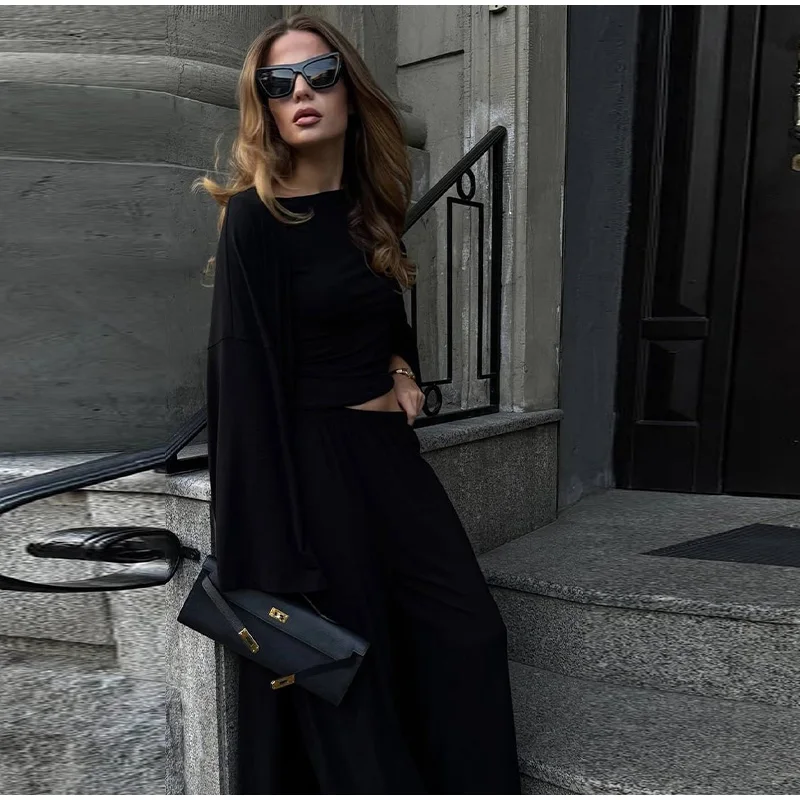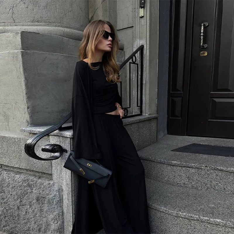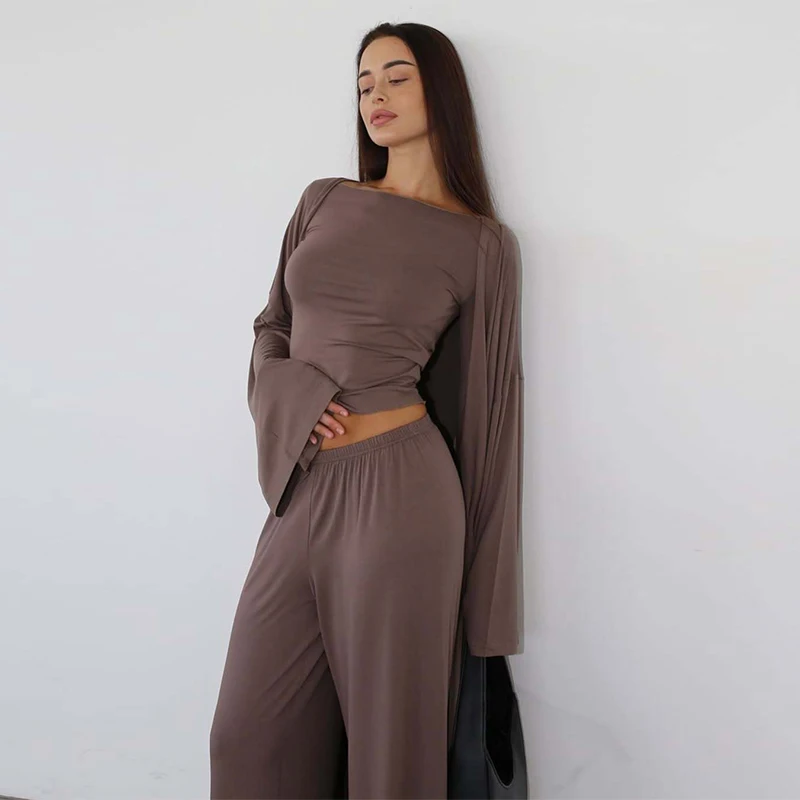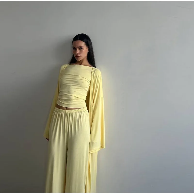 Pants Sets Women 3 Piece Off Shoulder Sleeveless Cropped Tank Top Long Cardgian Elastic Wide Leg Pant Female Suit Lady Outfits