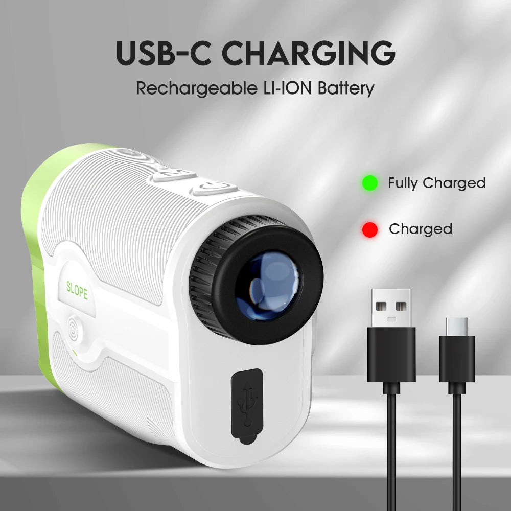 Long press the Power button to enter the scanning mode(Aim at the slope/background behind the flagpole). Move Target Indicator from background to flagpole slowly. The flagpole is locked successfully, the rangefinder vibrates and displays the measurement data.