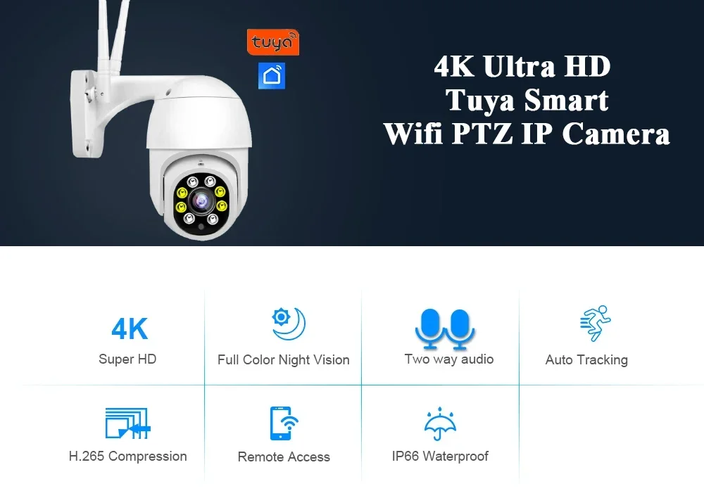 Smart Life 4K Full Color Night Vision IP PTZ Camera WiFi Tuya Wireless Security Surveillance Camera Auto Tracking CCTV Cam 8MP
